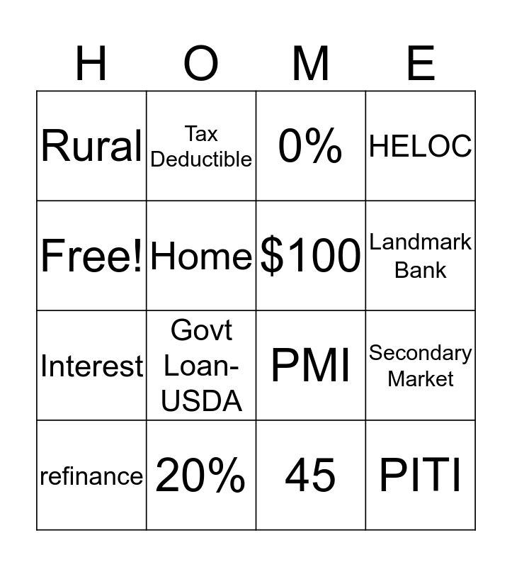 This bingo card has 16 words: 20%, Secondary Market, 0%, Rural, Interest, Tax Deductible, PMI, 45, Free!, Home, refinance, HELOC, Govt Loan- USDA, Landmark Bank, $100 and PITI.