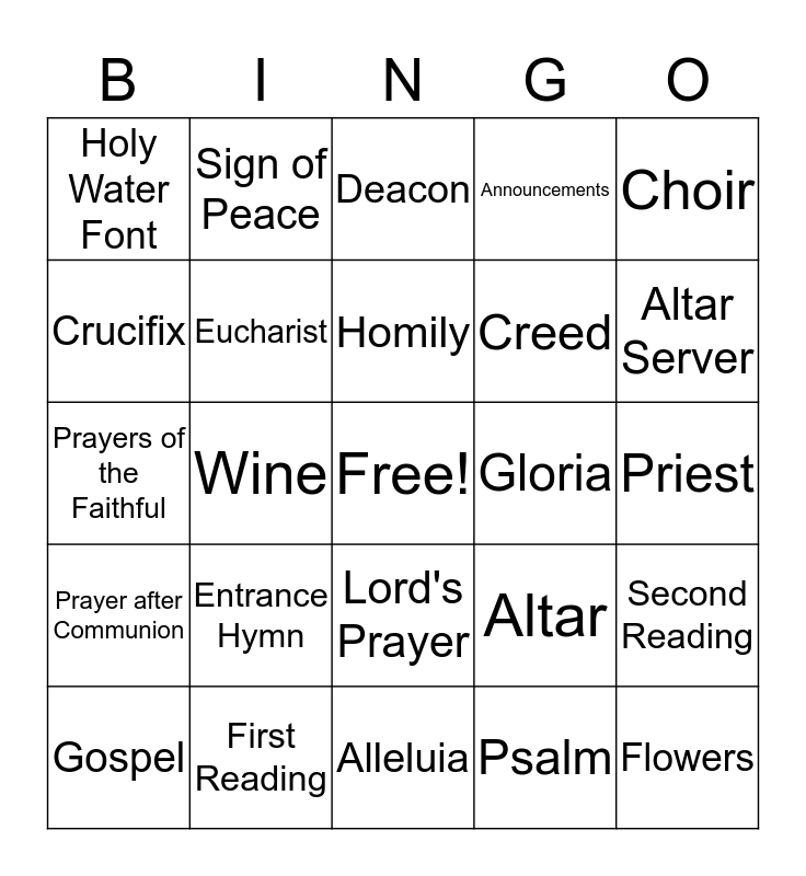 This bingo card has a free space and 24 words: Entrance Hymn, First Reading, Homily, Gospel, Choir, Holy Water Font, Crucifix, Sign of Peace, Gloria, Lord's Prayer, Creed, Prayers of the Faithful, Altar, Second Reading, Eucharist, Psalm, Priest, Deacon, Altar Server, Wine, Flowers, Prayer after Communion, Announcements and Alleluia.