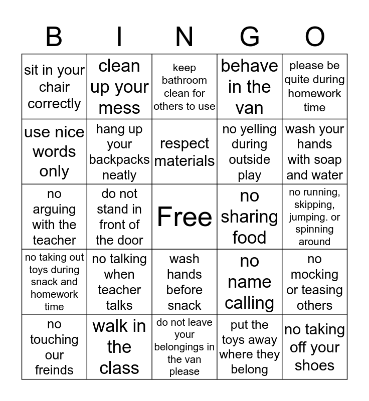 This bingo card has a free space and 24 words: no talking when teacher talks, walk in the class, respect materials, no touching our freinds, please be quite during homework time, sit in your chair correctly, use nice words only, clean up your mess, no sharing food, wash hands before snack, no yelling during outside play, no arguing with the teacher, no name calling, no mocking or teasing others, hang up your backpacks neatly, put the toys away where they belong, no running, skipping, jumping. or spinning around, keep bathroom clean for others to use, wash your hands with soap and water, do not stand in front of the door, no taking off your shoes, no taking out toys during snack and homework time, behave in the van and do not leave your belongings in the van please.