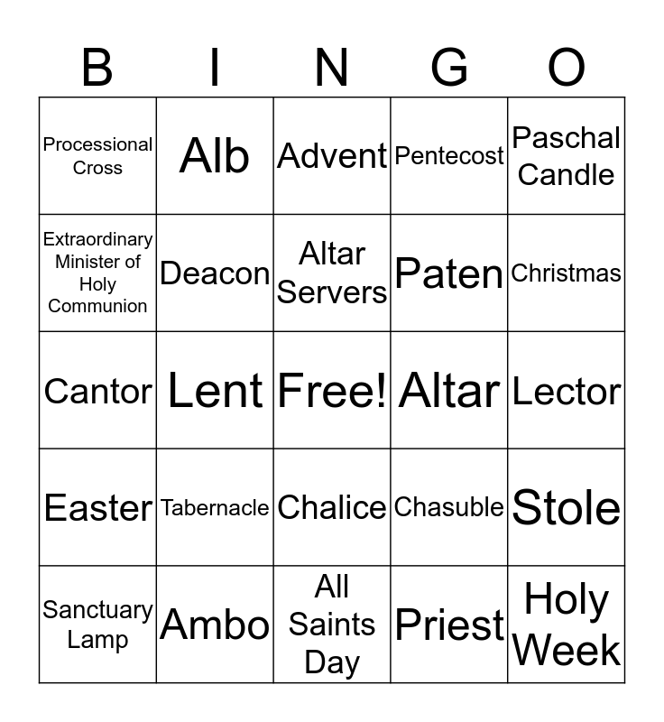 This bingo card has a free space and 24 words: Tabernacle, Ambo, Altar Servers, Sanctuary Lamp, Paschal Candle, Processional Cross, Extraordinary Minister of Holy Communion, Alb, Altar, Chalice, Paten, Cantor, Chasuble, Stole, Deacon, Priest, Lector, Advent, Christmas, Lent, Holy Week, Easter, Pentecost and All Saints Day.