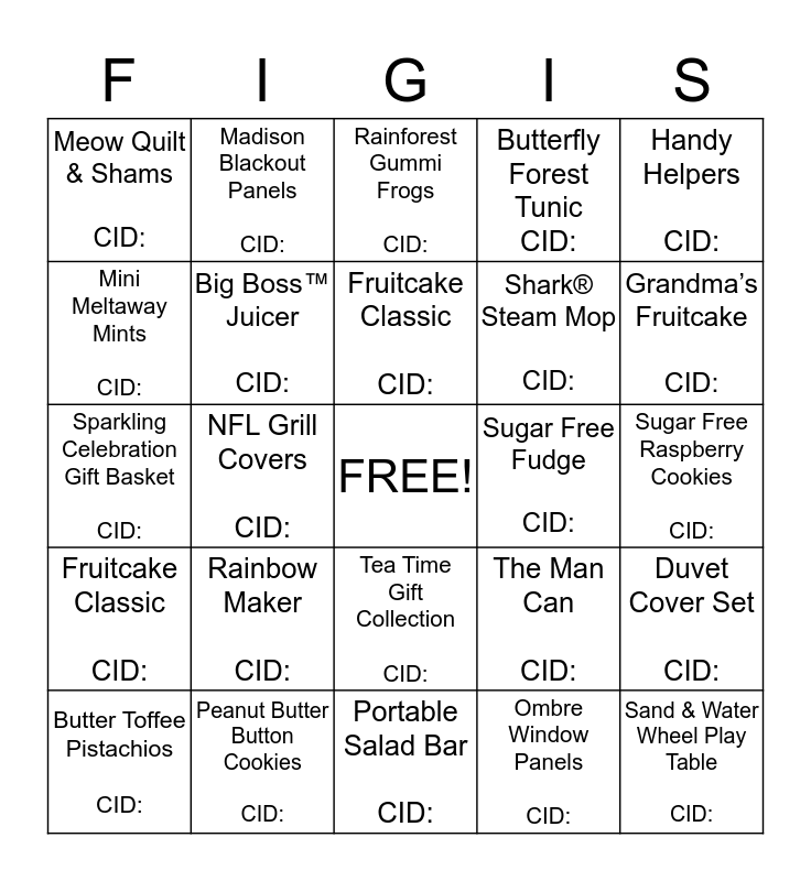 This bingo card has a free space and 24 words: Rainbow Maker CID:, Peanut Butter Button Cookies CID:, Fruitcake Classic CID:, Butter Toffee Pistachios CID:, Handy Helpers CID:, Meow Quilt & Shams CID:, Mini Meltaway Mints CID:, Madison Blackout Panels CID:, Sugar Free Fudge CID:, Tea Time Gift Collection CID:, Shark® Steam Mop CID:, Sparkling Celebration Gift Basket CID:, The Man Can CID:, Duvet Cover Set CID:, Big Boss™ Juicer CID:, Ombre Window Panels CID:, Sugar Free Raspberry Cookies CID:, Rainforest Gummi Frogs CID:, Grandma’s Fruitcake CID:, NFL Grill Covers CID:, Sand & Water Wheel Play Table CID:, Fruitcake Classic CID:, Butterfly Forest Tunic CID: and Portable Salad Bar CID:.