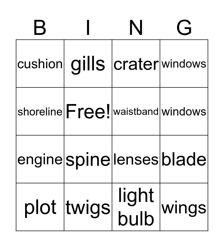 This bingo card has 16 words: twigs, blade, crater, cushion, engine, gills, lenses, light bulb, shoreline, Free!, plot, windows, spine, windows, waistband and wings.