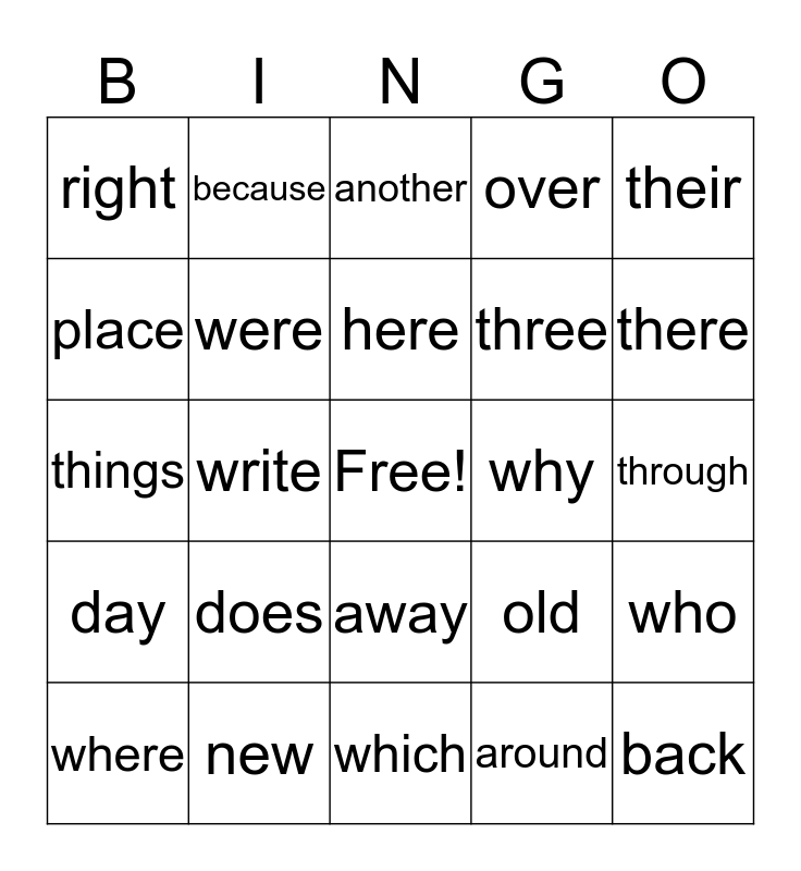 This bingo card has a free space and 24 words: does, new, here, where, their, right, place, because, why, away, three, things, old, who, were, around, through, another, there, write, back, day, over and which.
