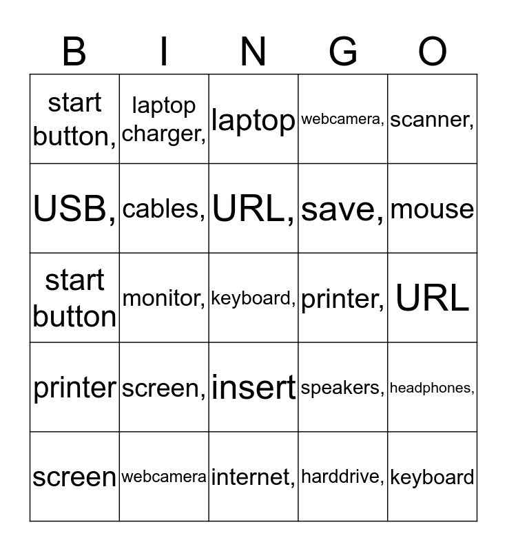 This bingo card has 51 words: Free!, keyboard,, mouse,, internet,, screen,, laptop,, laptop charger,, toolbar,, USB,, desktop,, cables,, webcamera,, headphones,, speakers,, Microsoft PowerPoint,, Microsoft Word,, URL,, printer,, CD/DVD drive,, scanner,, monitor,, harddrive,, start button,, save,, open,, keyboard, mouse, internet, screen, laptop, laptop charger, toolbar, USB, desktop, cables, webcamera, headphones, speakers, Microsoft PowerPoint, Microsoft Word, URL, printer, CD/DVD drive, scanner, monitor, harddrive, start button, save, open, insert and font.