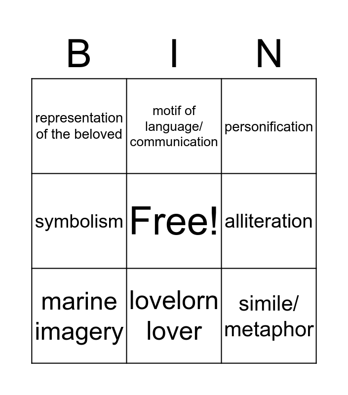 This bingo card has a free space and 8 words: alliteration, personification, motif of language/ communication, marine imagery, representation of the beloved, simile/ metaphor, symbolism and lovelorn lover.