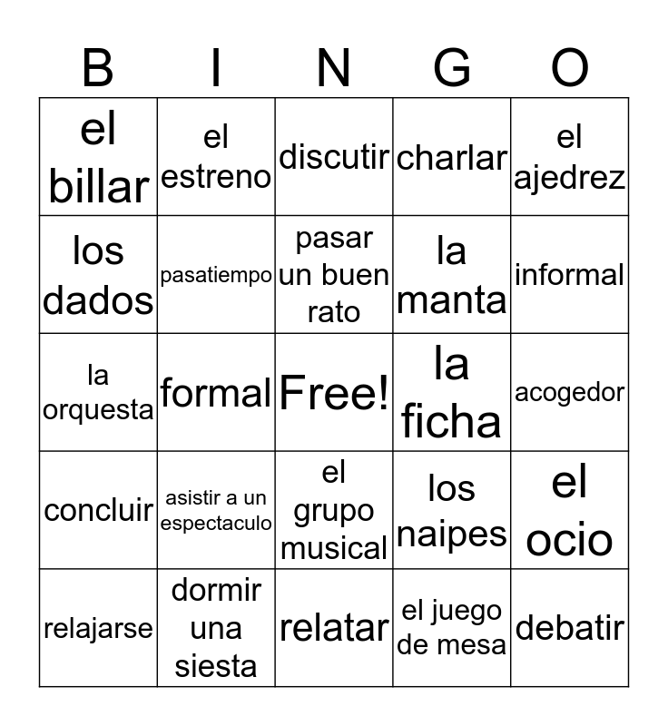 This bingo card has a free space and 24 words: asistir a un espectaculo, dormir una siesta, pasar un buen rato, relajarse, el ajedrez, el billar, los dados, el estreno, la ficha, el grupo musical, la manta, la orquesta, los naipes, el ocio, pasatiempo, el juego de mesa, acogedor, discutir, informal, formal, debatir, concluir, charlar and relatar.