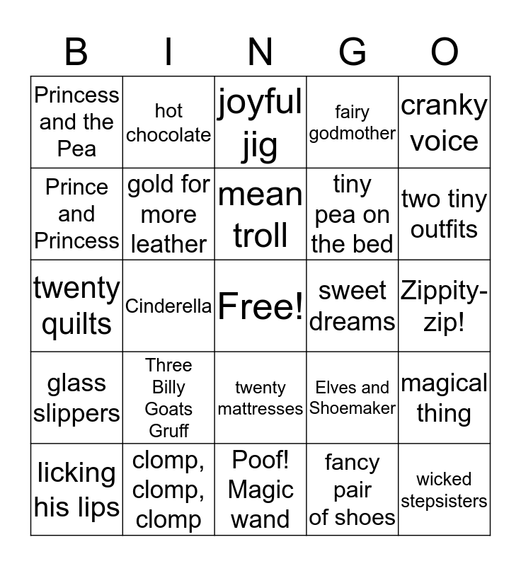 This bingo card has a free space and 24 words: Three Billy Goats Gruff, clomp, clomp, clomp, mean troll, licking his lips, cranky voice, Princess and the Pea, Prince and Princess, hot chocolate, sweet dreams, twenty mattresses, tiny pea on the bed, twenty quilts, Elves and Shoemaker, magical thing, gold for more leather, fancy pair of shoes, Zippity-zip!, joyful jig, two tiny outfits, Cinderella, wicked stepsisters, glass slippers, fairy godmother and Poof! Magic wand.