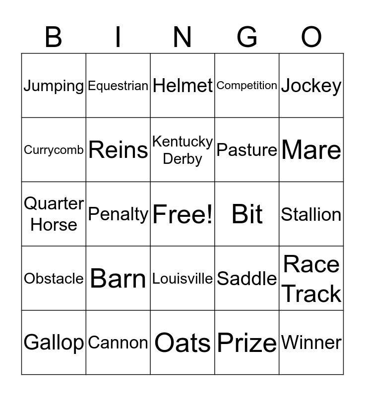 This bingo card has a free space and 24 words: Barn, Cannon, Kentucky Derby, Gallop, Jockey, Jumping, Currycomb, Equestrian, Bit, Louisville, Pasture, Quarter Horse, Saddle, Race Track, Reins, Prize, Stallion, Helmet, Mare, Penalty, Winner, Obstacle, Competition and Oats.