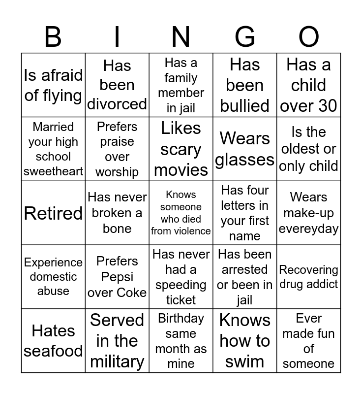 This bingo card has 30 words: Served in the military, Is a business owner, Has never broken a bone, Cancer Survivor, Is afraid of flying, Has a family member in jail, Prefers praise over worship, Has never had a speeding ticket, Has four letters in your first name, Birthday same month as mine, Wears make-up evereyday, Knows someone who died from violence, Knows how to swim, Ever made fun of someone, Is the oldest or only child, Never travelled outside of the state of Florida, Has been arrested or been in jail, Experience domestic abuse, Prefers Pepsi over Coke, Has a child over 30, Retired, Likes to read, Has been divorced, Wears glasses, Married your high school sweetheart, Has been bullied, Recovering drug addict, Hates seafood, Likes scary movies and Has been in a fight.