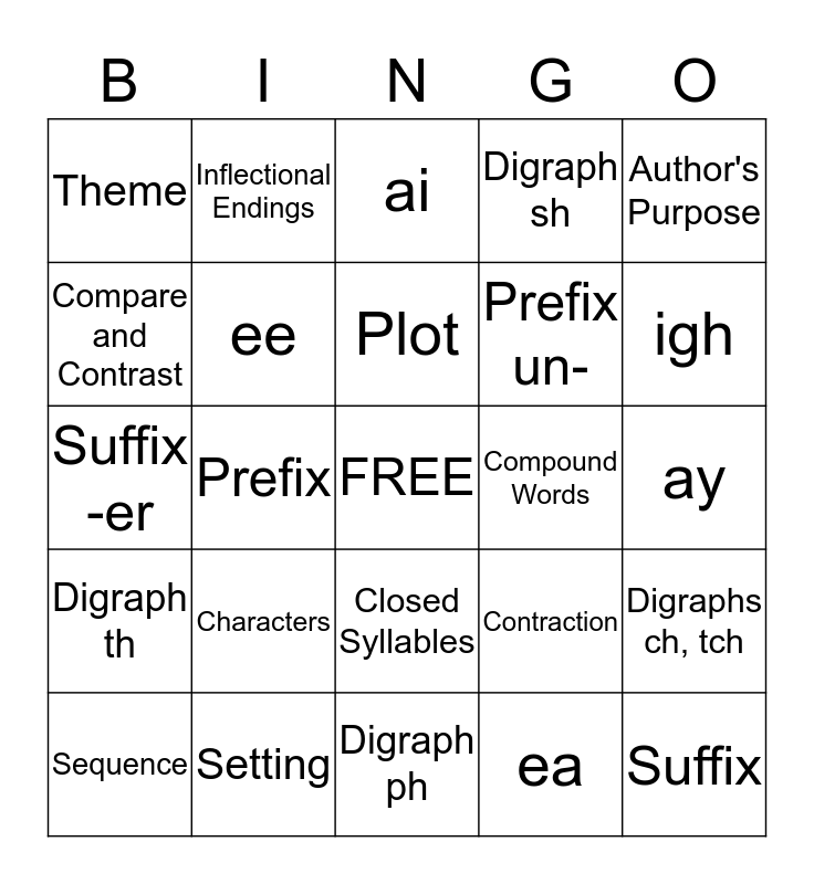 This bingo card has a free space and 24 words: Characters, Setting, Plot, Sequence, Author's Purpose, Theme, Compare and Contrast, Inflectional Endings, Compound Words, Closed Syllables, Prefix un-, Suffix -er, Contraction, Digraphs ch, tch, ee, ea, ay, ai, igh, Prefix, Suffix, Digraph th, Digraph sh and Digraph ph.