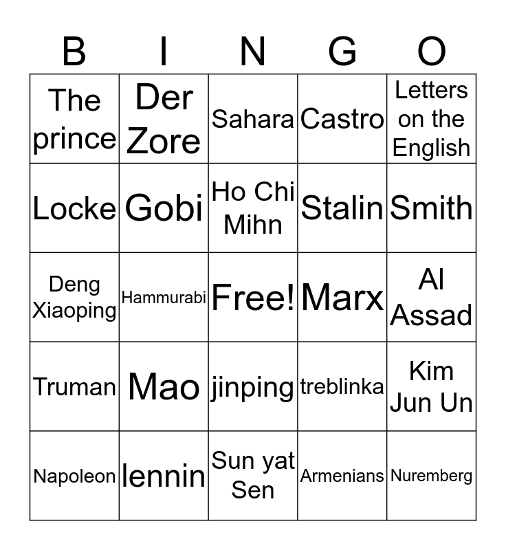 This bingo card has a free space and 24 words: Mao, lennin, Ho Chi Mihn, Napoleon, Letters on the English, The prince, Locke, Der Zore, Marx, jinping, Stalin, Deng Xiaoping, treblinka, Kim Jun Un, Gobi, Armenians, Al Assad, Sahara, Smith, Hammurabi, Nuremberg, Truman, Castro and Sun yat Sen.