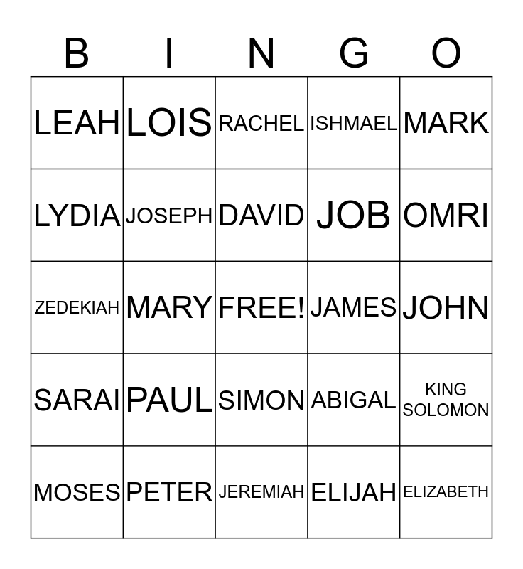 This bingo card has a free space and 24 words: PAUL, PETER, DAVID, MOSES, MARK, LEAH, LYDIA, LOIS, JAMES, SIMON, JOB, ZEDEKIAH, ABIGAL, KING SOLOMON, JOSEPH, ELIJAH, JOHN, RACHEL, OMRI, MARY, ELIZABETH, SARAI, ISHMAEL and JEREMIAH.