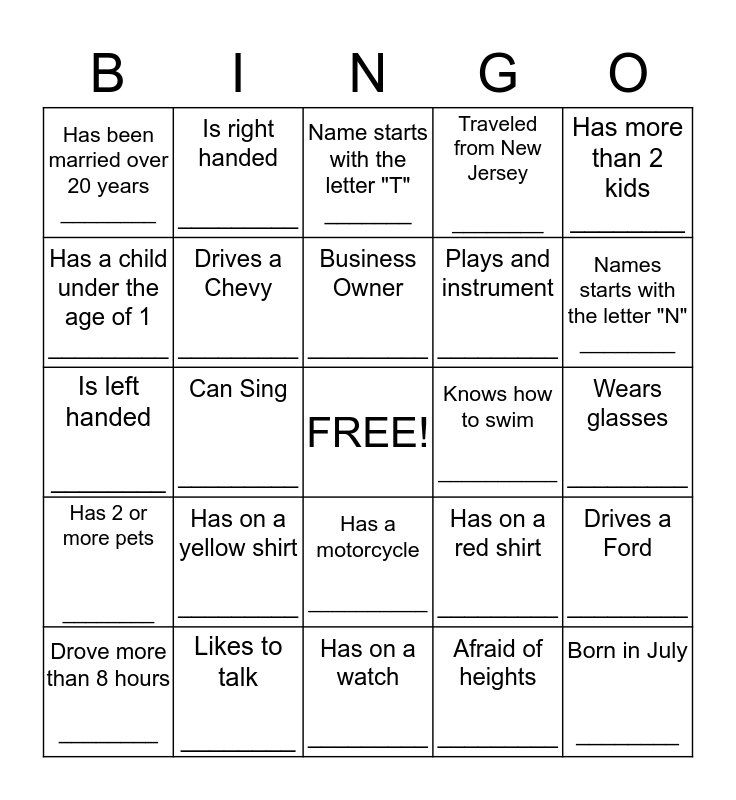 This bingo card has a free space and 24 words: Has on a yellow shirt _________, Likes to talk ________, Business Owner _________, Drove more than 8 hours ________, Has more than 2 kids ________, Has been married over 20 years ________, Has a child under the age of 1 _________, Is right handed _________, Knows how to swim __________, Has a motorcycle __________, Plays and instrument _________, Is left handed ________, Has on a red shirt _________, Drives a Ford _________, Drives a Chevy _________, Afraid of heights _________, Wears glasses _________, Name starts with the letter "T" _______, Names starts with the letter "N" ________, Can Sing _________, Born in July ________, Has 2 or more pets ________, Traveled from New Jersey ________ and Has on a watch _________.