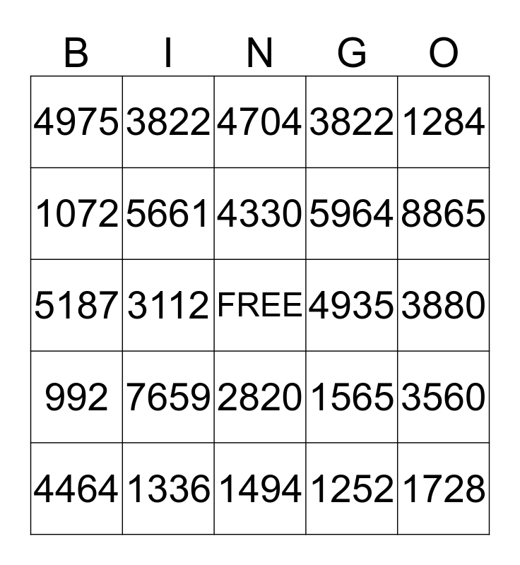 This bingo card has a free space and 24 words: 7659, 1336, 4330, 4464, 1284, 4975, 1072, 3822, 4935, 2820, 5964, 5187, 1565, 3560, 5661, 1252, 3880, 4704, 8865, 3112, 1728, 992, 3822 and 1494.