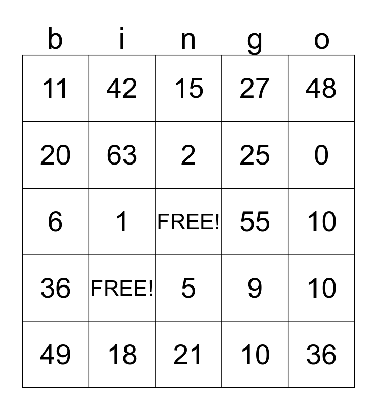 This bingo card has a free space and 24 words: FREE!, 18, 2, 49, 48, 11, 20, 42, 55, 5, 25, 6, 9, 10, 63, 10, 10, 15, 0, 1, 36, 36, 27 and 21.