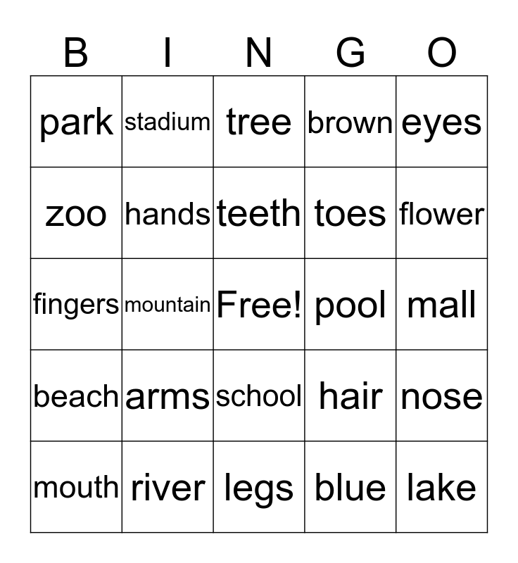 This bingo card has a free space and 25 words: arms, legs, teeth, mouth, eyes, park, zoo, stadium, pool, school, toes, fingers, hair, nose, hands, feet, mall, tree, flower, mountain, lake, river, beach, brown and blue.