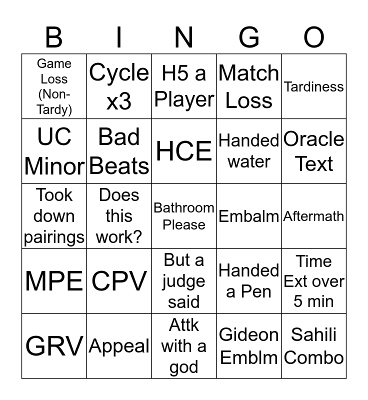 This bingo card has 25 words: CPV, Attk with a god, HCE, GRV, Tardiness, Game Loss (Non-Tardy), UC Minor, Cycle x3, Embalm, But a judge said, Handed water, Took down pairings, Handed a Pen, Time Ext over 5 min, Bad Beats, Sahili Combo, Aftermath, H5 a Player, Oracle Text, Does this work?, Bathroom Please, Appeal, MPE, Match Loss and Gideon Emblm.