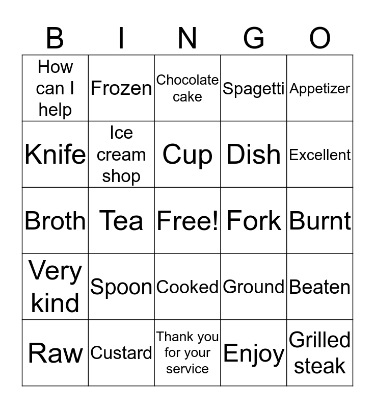 This bingo card has a free space and 24 words: Spoon, Custard, Cup, Raw, Appetizer, How can I help, Knife, Frozen, Fork, Cooked, Dish, Broth, Ground, Beaten, Ice cream shop, Enjoy, Burnt, Chocolate cake, Excellent, Tea, Grilled steak, Very kind, Spagetti and Thank you for your service.