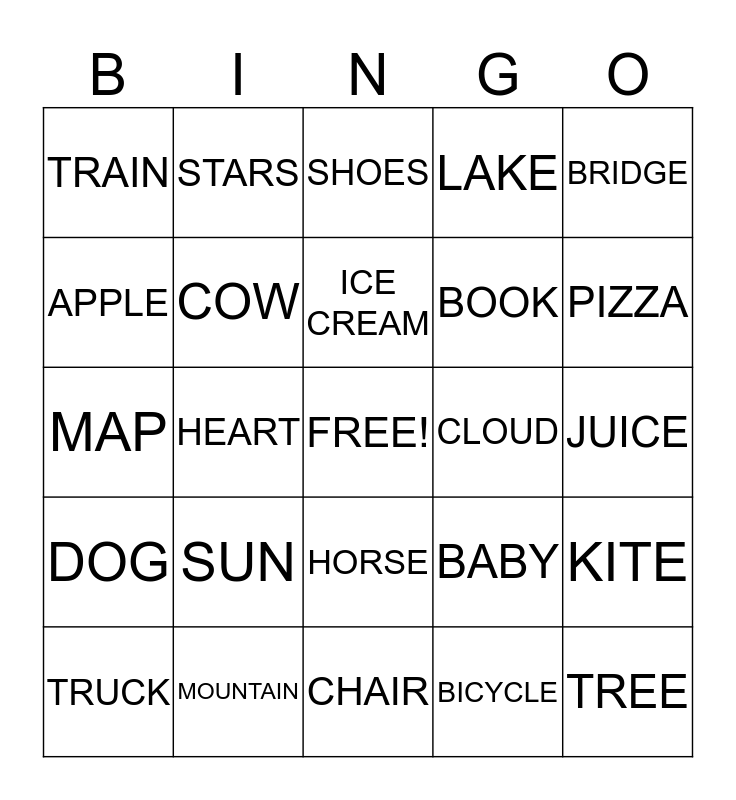 This bingo card has a free space and 24 words: SUN, MOUNTAIN, ICE CREAM, TRUCK, BRIDGE, TRAIN, APPLE, STARS, CLOUD, HORSE, BOOK, MAP, BABY, KITE, COW, BICYCLE, JUICE, SHOES, PIZZA, HEART, TREE, DOG, LAKE and CHAIR.