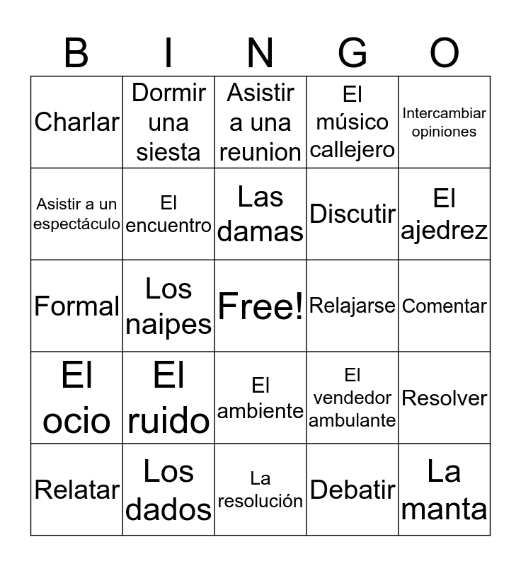 This bingo card has a free space and 24 words: El ruido, Los dados, Las damas, Relatar, Intercambiar opiniones, Charlar, Asistir a un espectáculo, Dormir una siesta, Relajarse, El ambiente, Discutir, Formal, El vendedor ambulante, Resolver, El encuentro, Debatir, Comentar, Asistir a una reunion, El ajedrez, Los naipes, La manta, El ocio, El músico callejero and La resolución.