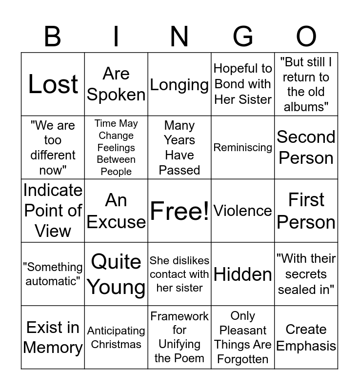 This bingo card has a free space and 24 words: Quite Young, Anticipating Christmas, Many Years Have Passed, Exist in Memory, "But still I return to the old albums", Lost, "We are too different now", Are Spoken, Violence, She dislikes contact with her sister, Reminiscing, Indicate Point of View, Hidden, "With their secrets sealed in", Time May Change Feelings Between People, Only Pleasant Things Are Forgotten, First Person, Longing, Second Person, An Excuse, Create Emphasis, "Something automatic", Hopeful to Bond with Her Sister and Framework for Unifying the Poem.