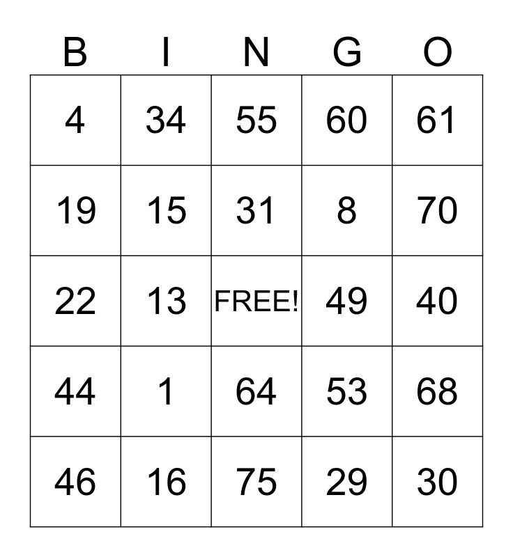 This bingo card has a free space and 24 words: 1, 16, 31, 46, 61, 4, 19, 34, 49, 64, 8, 22, 53, 68, 15, 29, 40, 55, 70, 13, 30, 44, 60 and 75.