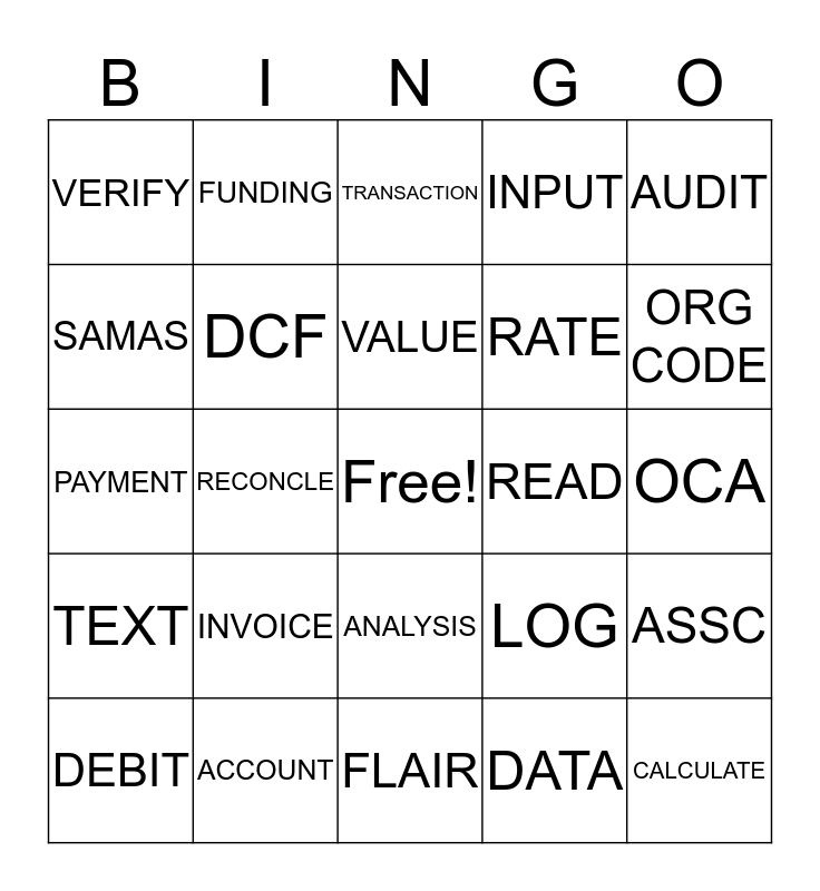 This bingo card has a free space and 25 words: INVOICE, FLAIR, VALUE, DEBIT, AUDIT, VERIFY, SAMAS, FUNDING, READ, ANALYSIS, RATE, PAYMENT, LOG, ASSC, DCF, MATH, OCA, TRANSACTION, ORG CODE, RECONCLE, CALCULATE, ACCOUNT, TEXT, INPUT and DATA.