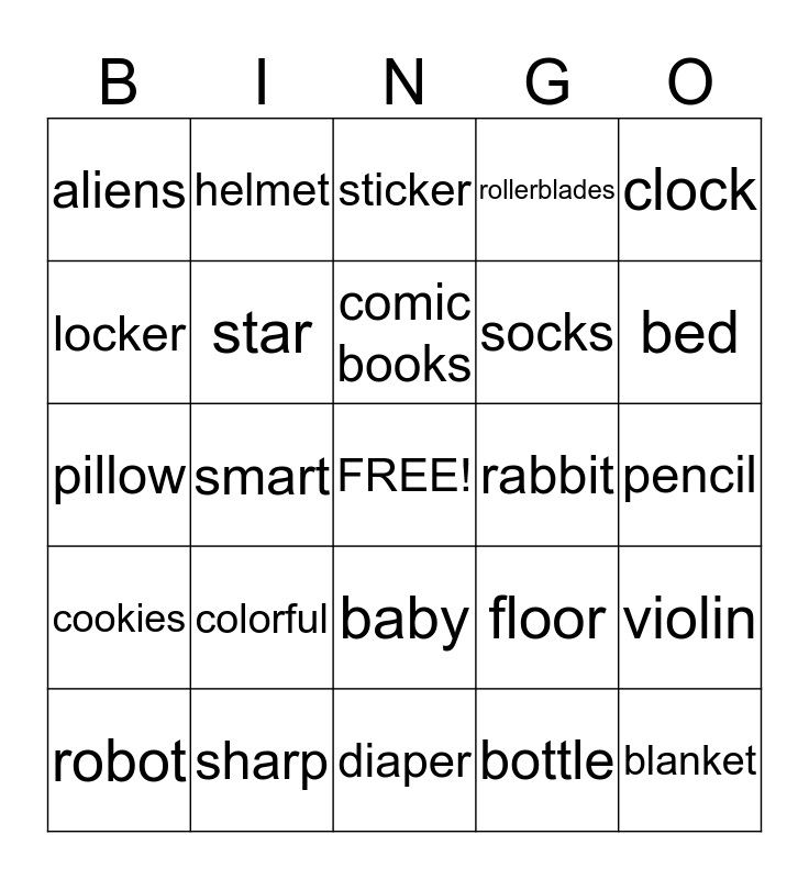 This bingo card has a free space and 29 words: robot, fast, smart, strong, aliens, sticker, star, colorful, rabbit, sharp, pencil, blanket, diaper, bottle, bed, new, baby, cookies, clock, pillow, floor, picture, socks, locker, rollerblades, helmet, violin, comic books and key.