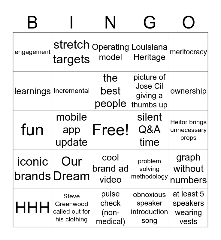 This bingo card has a free space and 24 words: Our Dream, Steve Greenwood called out for his clothing, the best people, HHH, meritocracy, engagement, learnings, stretch targets, silent Q&A time, cool brand ad video, picture of Jose Cil giving a thumbs up, fun, problem solving methodology, graph without numbers, Incremental, obnoxious speaker introduction song, Heitor brings unnecessary props, Operating model, ownership, mobile app update, at least 5 speakers wearing vests, iconic brands, Louisiana Heritage and pulse check (non-medical).