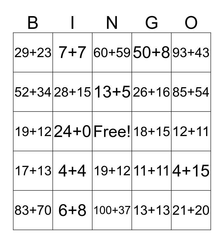 This bingo card has a free space and 24 words: 4+4, 6+8, 13+5, 83+70, 93+43, 29+23, 52+34, 7+7, 18+15, 19+12, 26+16, 19+12, 11+11, 4+15, 28+15, 13+13, 12+11, 60+59, 85+54, 24+0, 21+20, 17+13, 50+8 and 100+37.