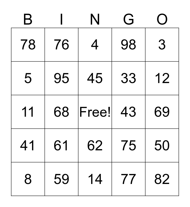 This bingo card has a free space and 25 words: 61, 14, 45, 8, 3, 78, 5, 76, 43, 62, 33, 11, 75, 50, 95, 29, 69, 4, 12, 68, 82, 59, 41, 98 and 77.