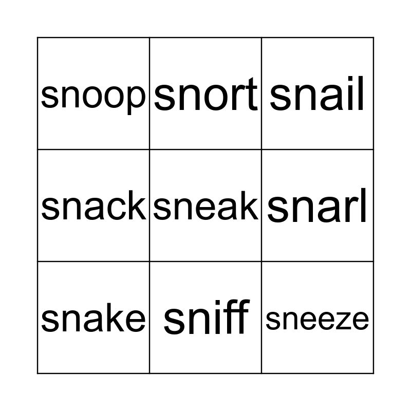 This bingo card has 9 words: snake, snail, snort, snack, snoop, snarl, sneak, sneeze and sniff.