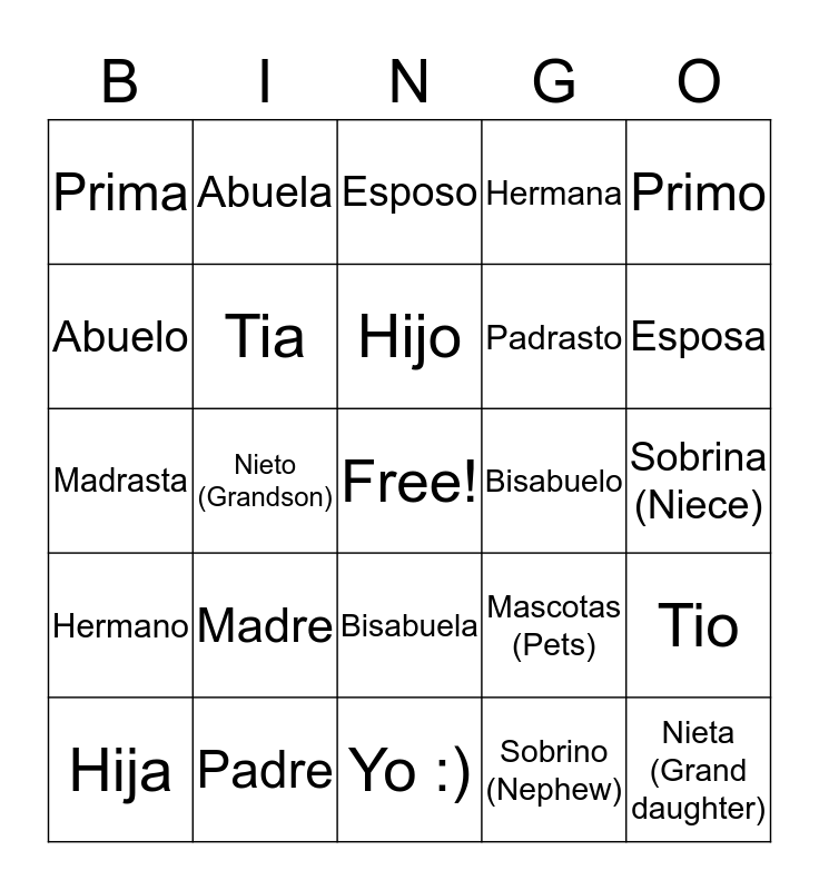 This bingo card has a free space and 24 words: Madre, Padre, Hijo, Hija, Primo, Prima, Abuelo, Abuela, Bisabuelo, Bisabuela, Padrasto, Madrasta, Mascotas (Pets), Tio, Tia, Sobrino (Nephew), Sobrina (Niece), Esposo, Esposa, Nieto (Grandson), Nieta (Grand daughter), Hermano, Hermana and Yo :).