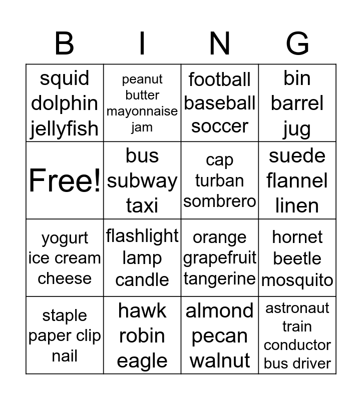 This bingo card has 16 words: hawk robin eagle, hornet beetle mosquito, football baseball soccer, squid dolphin jellyfish, yogurt ice cream cheese, peanut butter mayonnaise jam, orange grapefruit tangerine, almond pecan walnut, Free!, bus subway taxi, staple paper clip nail, bin barrel jug, flashlight lamp candle, suede flannel linen, cap turban sombrero and astronaut train conductor bus driver.