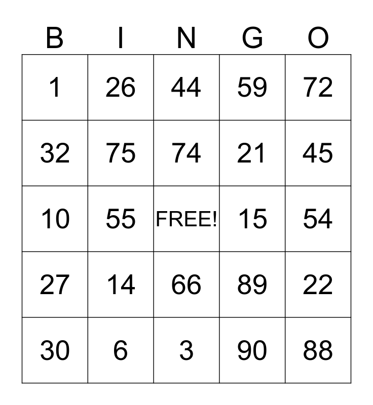 This bingo card has a free space and 24 words: 14, 6, 74, 30, 72, 1, 32, 26, 15, 66, 21, 10, 89, 22, 75, 90, 54, 44, 45, 55, 88, 27, 59 and 3.