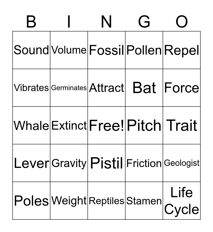 This bingo card has a free space and 24 words: Gravity, Weight, Attract, Poles, Repel, Sound, Vibrates, Volume, Pitch, Pistil, Bat, Whale, Friction, Geologist, Germinates, Stamen, Trait, Fossil, Force, Extinct, Life Cycle, Lever, Pollen and Reptiles.