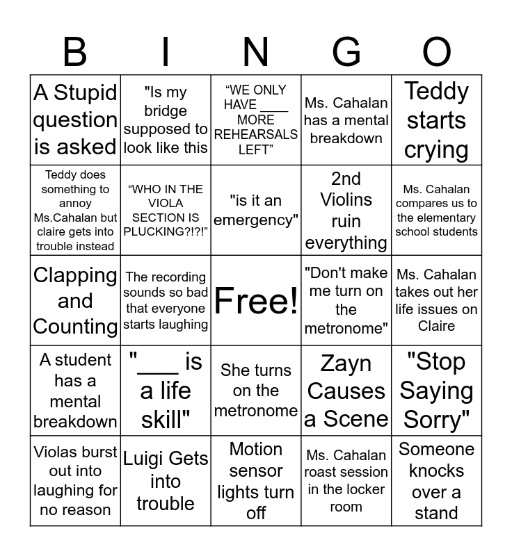 This bingo card has a free space and 24 words: "___ is a life skill", Luigi Gets into trouble, "is it an emergency", Violas burst out into laughing for no reason, Teddy starts crying, A Stupid question is asked, Teddy does something to annoy Ms.Cahalan but claire gets into trouble instead, "Is my bridge supposed to look like this, "Don't make me turn on the metronome", She turns on the metronome, 2nd Violins ruin everything, Clapping and Counting, Zayn Causes a Scene, "Stop Saying Sorry", “WHO IN THE VIOLA SECTION IS PLUCKING?!?!”, Ms. Cahalan roast session in the locker room, Ms. Cahalan takes out her life issues on Claire, “WE ONLY HAVE ____ MORE REHEARSALS LEFT”, Ms. Cahalan compares us to the elementary school students, The recording sounds so bad that everyone starts laughing, Someone knocks over a stand, A student has a mental breakdown, Ms. Cahalan has a mental breakdown and Motion sensor lights turn off.