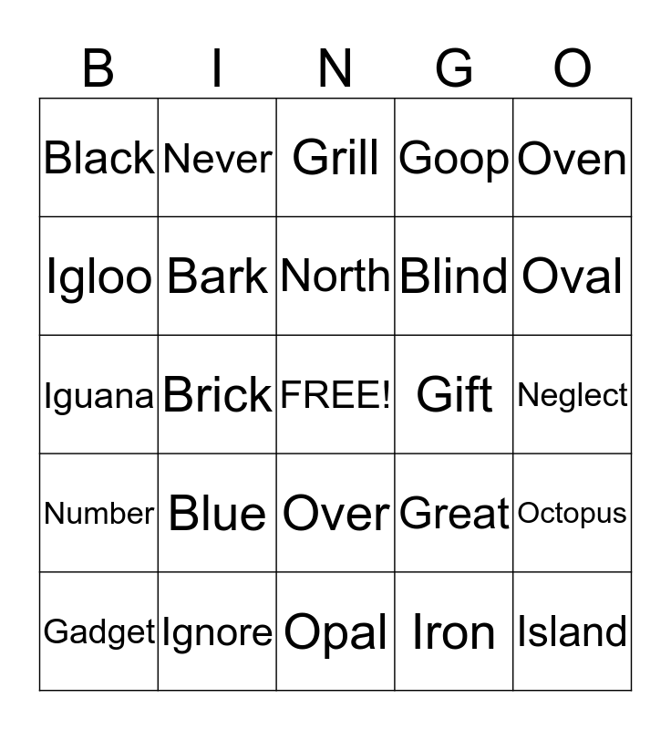 This bingo card has a free space and 24 words: Blue, Ignore, North, Gadget, Oven, Black, Igloo, Never, Gift, Over, Blind, Iguana, Great, Octopus, Bark, Iron, Neglect, Grill, Oval, Brick, Island, Number, Goop and Opal.