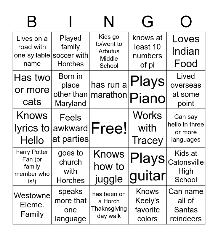 This bingo card has a free space and 24 words: goes to church with Horches, speaks more that one language, has run a marathon, Westowne Eleme. Family, Loves Indian Food, Lives on a road with one syllable name, Has two or more cats, Played family soccer with Horches, Works with Tracey, Knows how to juggle, Plays Piano, Knows lyrics to Hello, Plays guitar, Kids at Catonsville High School, Born in place other than Maryland, Knows Keely's favorite colors, Can say hello in three or more languages, Kids go to/went to Arbutus Middle School, Lived overseas at some point, Feels awkward at parties, Can name all of Santas reindeers, harry Potter Fan (or family member who is!), knows at least 10 numbers of pi and has been on a Horch Thaknsgiving day walk.