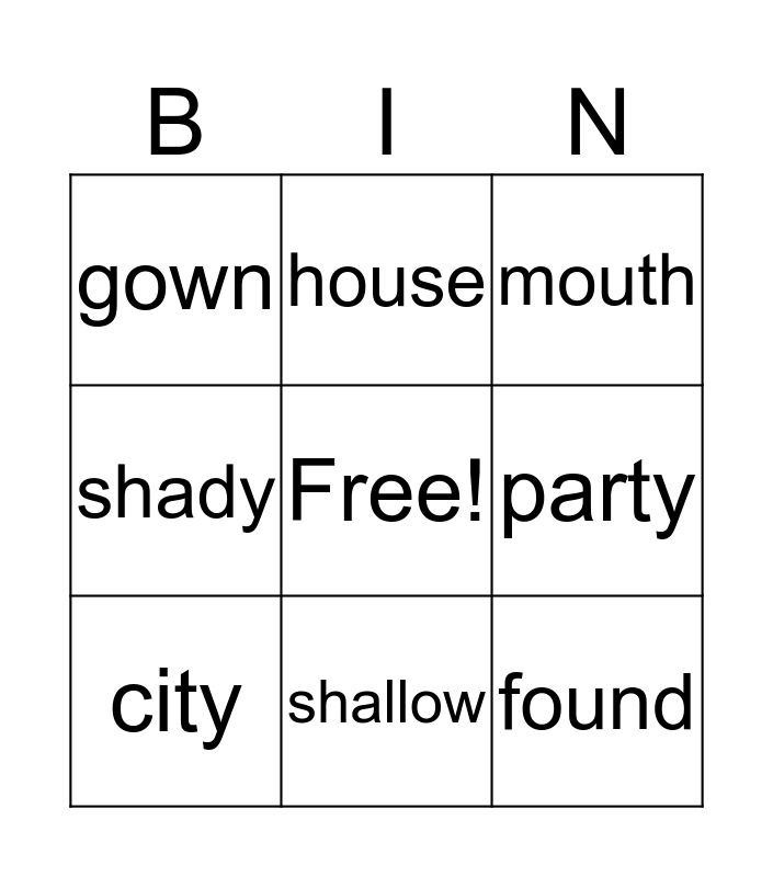This bingo card has a free space and 20 words: crowd, round, mouth, owl, ouch, found, outside, gown, town, house, please, family, party, myself, city, blossoms, shallow, shady, ledge and lugging.