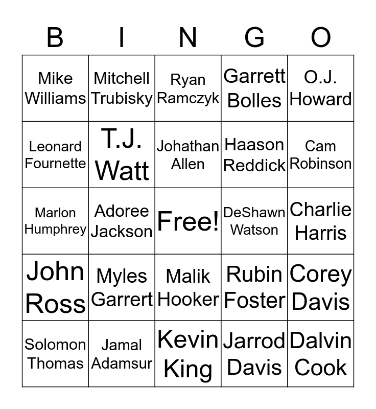 This bingo card has a free space and 24 words: Myles Garrert, Jamal Adamsur, Johathan Allen, Solomon Thomas, O.J. Howard, Mike Williams, Leonard Fournette, Mitchell Trubisky, DeShawn Watson, Malik Hooker, Haason Reddick, Marlon Humphrey, Rubin Foster, Corey Davis, T.J. Watt, Jarrod Davis, Charlie Harris, Ryan Ramczyk, Cam Robinson, Adoree Jackson, Dalvin Cook, John Ross, Garrett Bolles and Kevin King.