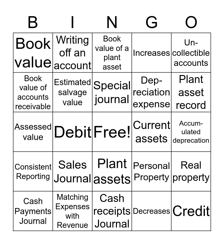 This bingo card has a free space and 25 words: Sales Journal, Cash receipts Journal, Special journal, Cash Payments Journal, Un- collectible accounts, Book value, Book value of accounts receivable, Writing off an account, Current assets, Plant assets, Dep- reciation expense, Assessed value, Personal Property, Real property, Estimated salvage value, Straight line method of depreciation, Accum-ulated deprecation, Book value of a plant asset, Plant asset record, Debit, Credit, Matching Expenses with Revenue, Consistent Reporting, Increases and Decreases.