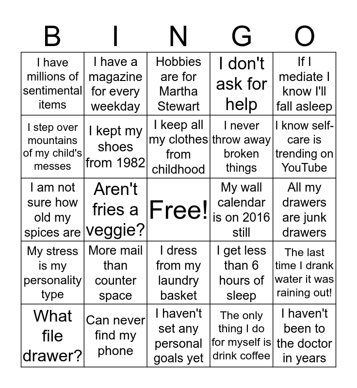 This bingo card has a free space and 24 words: More mail than counter space, Can never find my phone, I keep all my clothes from childhood, What file drawer?, If I mediate I know I'll fall asleep, I have millions of sentimental items, I step over mountains of my child's messes, I have a magazine for every weekday, My wall calendar is on 2016 still, I dress from my laundry basket, I never throw away broken things, I am not sure how old my spices are, I get less than 6 hours of sleep, The last time I drank water it was raining out!, I kept my shoes from 1982, The only thing I do for myself is drink coffee, All my drawers are junk drawers, Hobbies are for Martha Stewart, I know self-care is trending on YouTube, Aren't fries a veggie?, I haven't been to the doctor in years, My stress is my personality type, I don't ask for help and I haven't set any personal goals yet.