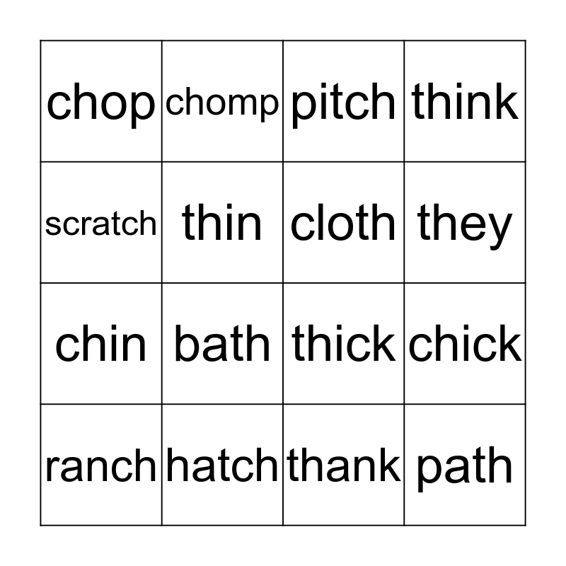 This bingo card has 20 words: chick, check, pitch, chips, ranch, scratch, hatch, chop, chin, chomp, bath, thick, thin, path, cloth, then, they, think, thank and with.