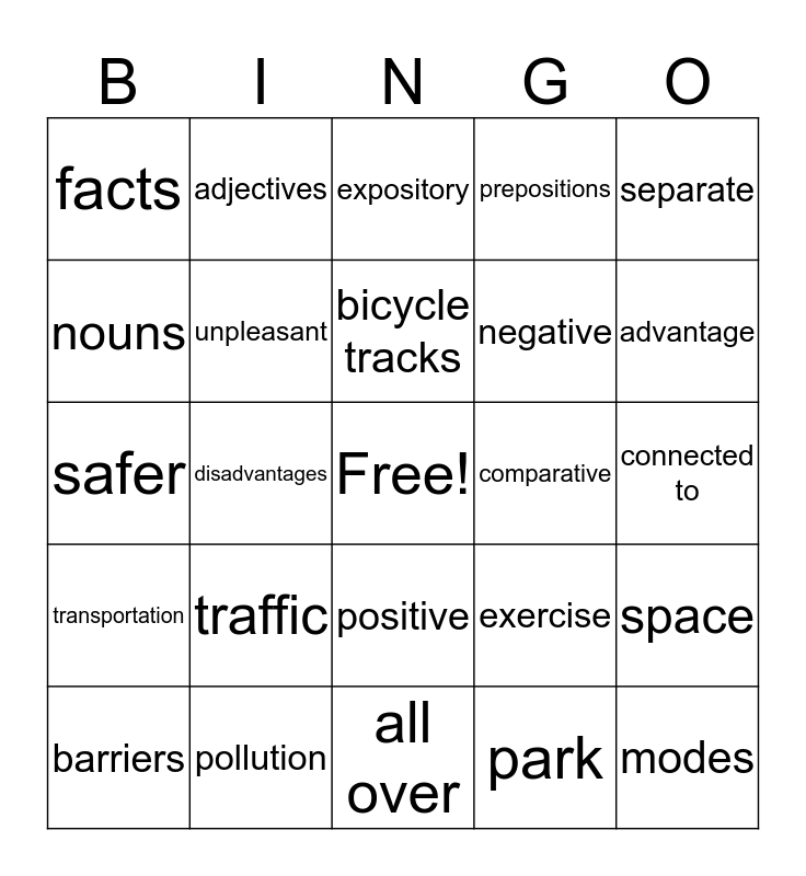 This bingo card has a free space and 24 words: traffic, pollution, bicycle tracks, barriers, separate, facts, nouns, adjectives, comparative, positive, negative, safer, exercise, space, unpleasant, park, connected to, expository, advantage, disadvantages, modes, transportation, prepositions and all over.