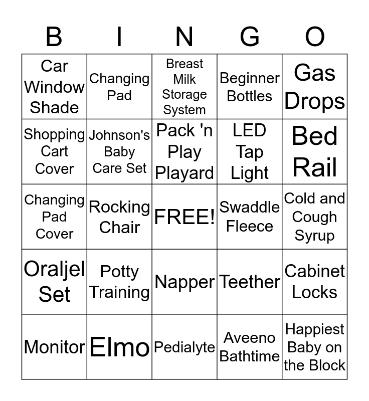 This bingo card has a free space and 24 words: Potty Training, Elmo, Pack 'n Play Playard, Monitor, Gas Drops, Car Window Shade, Shopping Cart Cover, Changing Pad, Swaddle Fleece, Napper, LED Tap Light, Changing Pad Cover, Teether, Cabinet Locks, Johnson's Baby Care Set, Aveeno Bathtime, Cold and Cough Syrup, Breast Milk Storage System, Bed Rail, Rocking Chair, Happiest Baby on the Block, Oraljel Set, Beginner Bottles and Pedialyte.