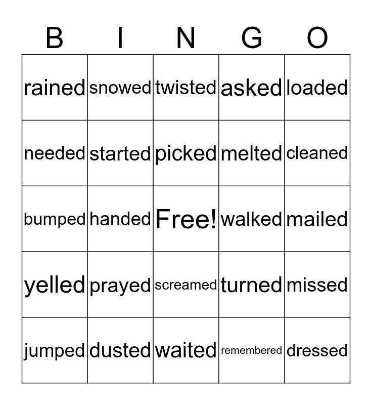 This bingo card has a free space and 25 words: prayed, waited, picked, jumped, loaded, rained, needed, snowed, walked, screamed, melted, bumped, turned, missed, started, passed, mailed, twisted, cleaned, handed, dressed, dusted, yelled, asked and remembered.