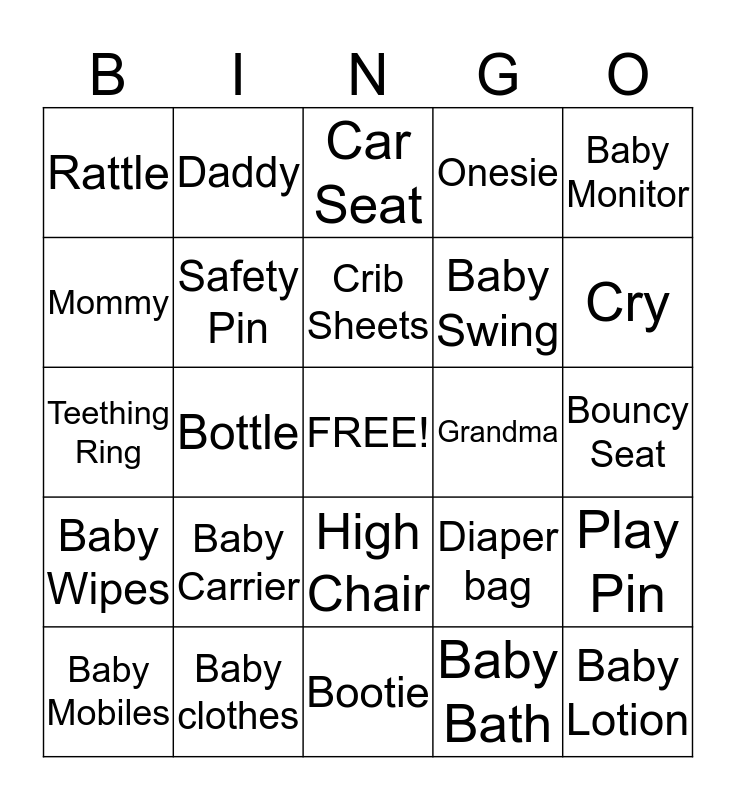 This bingo card has a free space and 24 words: Baby Carrier, Baby clothes, Crib Sheets, Baby Mobiles, Baby Monitor, Rattle, Mommy, Daddy, Grandma, High Chair, Baby Swing, Teething Ring, Diaper bag, Play Pin, Safety Pin, Baby Bath, Bouncy Seat, Car Seat, Cry, Bottle, Baby Lotion, Baby Wipes, Onesie and Bootie.
