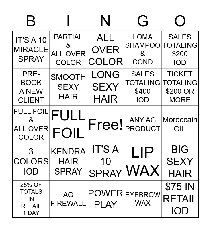 This bingo card has a free space and 24 words: KENDRA HAIR SPRAY, AG FIREWALL, LONG SEXY HAIR, 25% OF TOTALS IN RETAIL 1 DAY, SALES TOTALING $200 IOD, IT'S A 10 MIRACLE SPRAY, PRE-BOOK A NEW CLIENT, PARTIAL & ALL OVER COLOR, ANY AG PRODUCT, IT'S A 10 SPRAY, SALES TOTALING $400 IOD, FULL FOIL & ALL OVER COLOR, LIP WAX, BIG SEXY HAIR, SMOOTH SEXY HAIR, EYEBROW WAX, Moroccain OIL, ALL OVER COLOR, TICKET TOTALING $200 OR MORE, FULL FOIL, $75 IN RETAIL IOD, 3 COLORS IOD, LOMA SHAMPOO & COND and POWER PLAY.