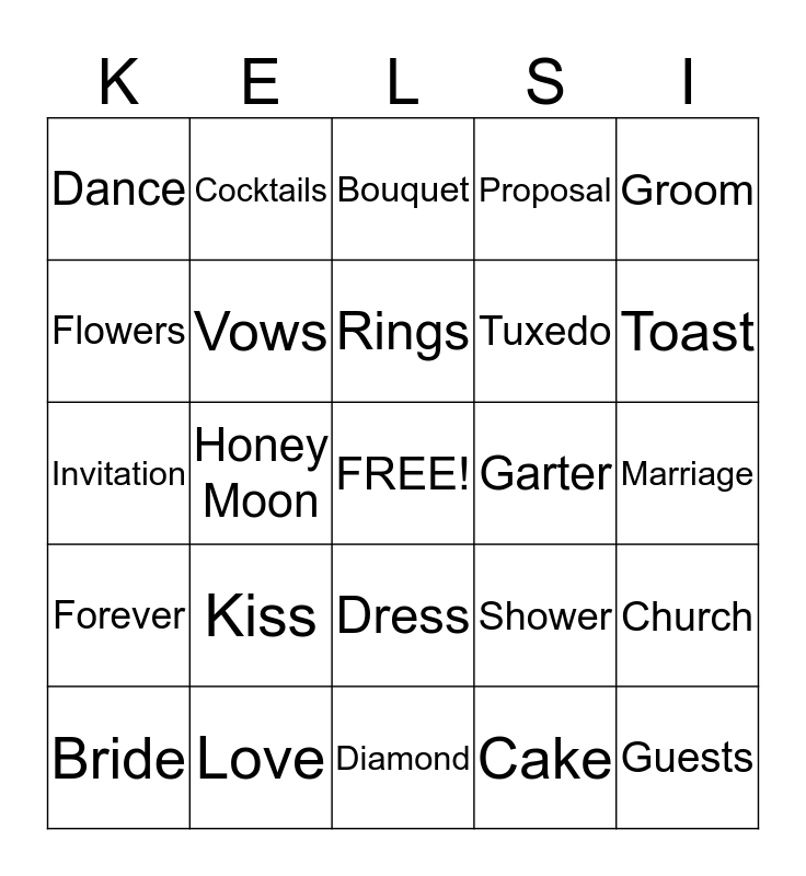 This bingo card has a free space and 24 words: Kiss, Love, Rings, Bride, Groom, Dance, Flowers, Cocktails, Garter, Dress, Tuxedo, Invitation, Shower, Church, Vows, Cake, Marriage, Bouquet, Toast, Honey Moon, Guests, Forever, Proposal and Diamond.